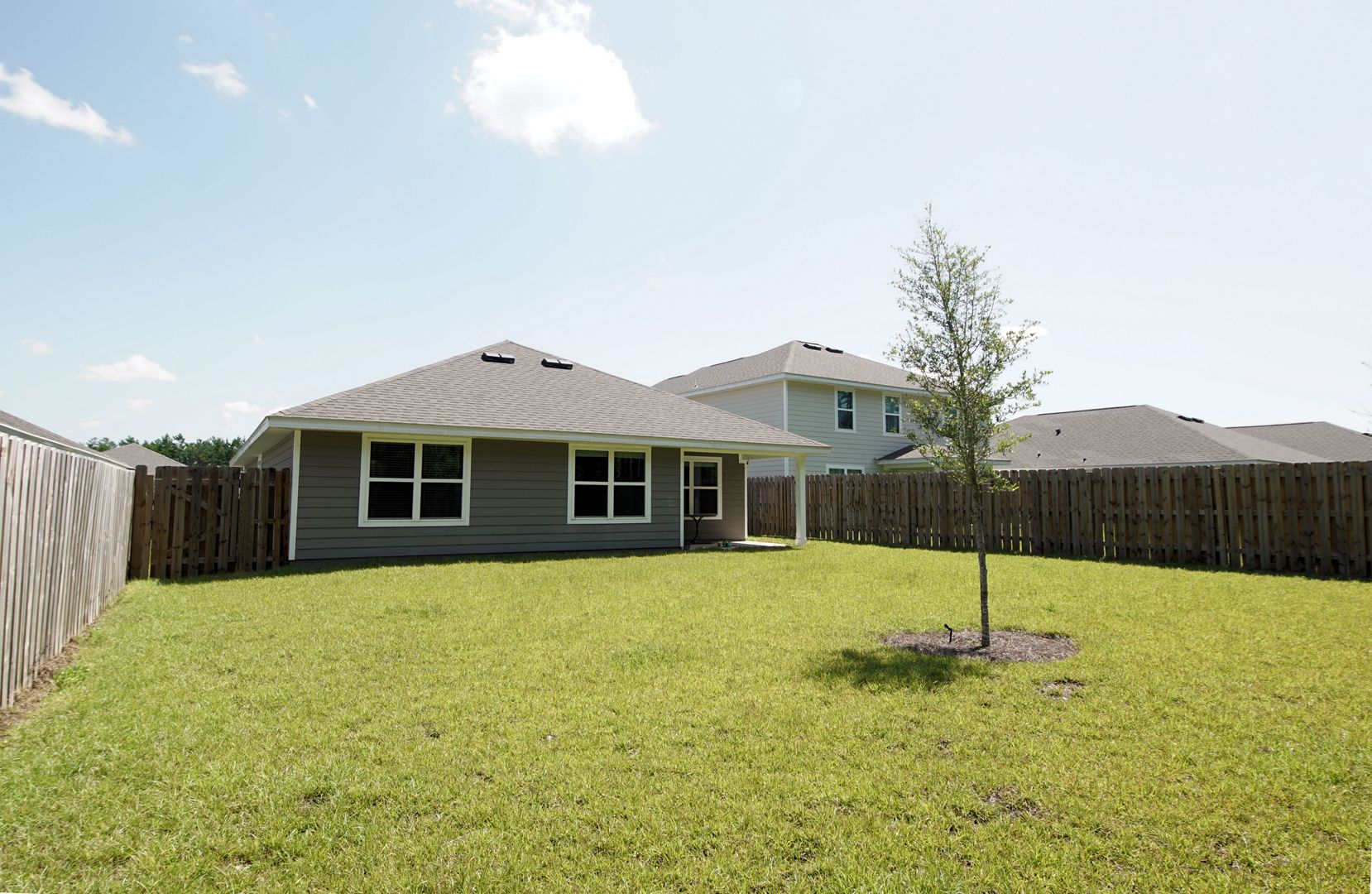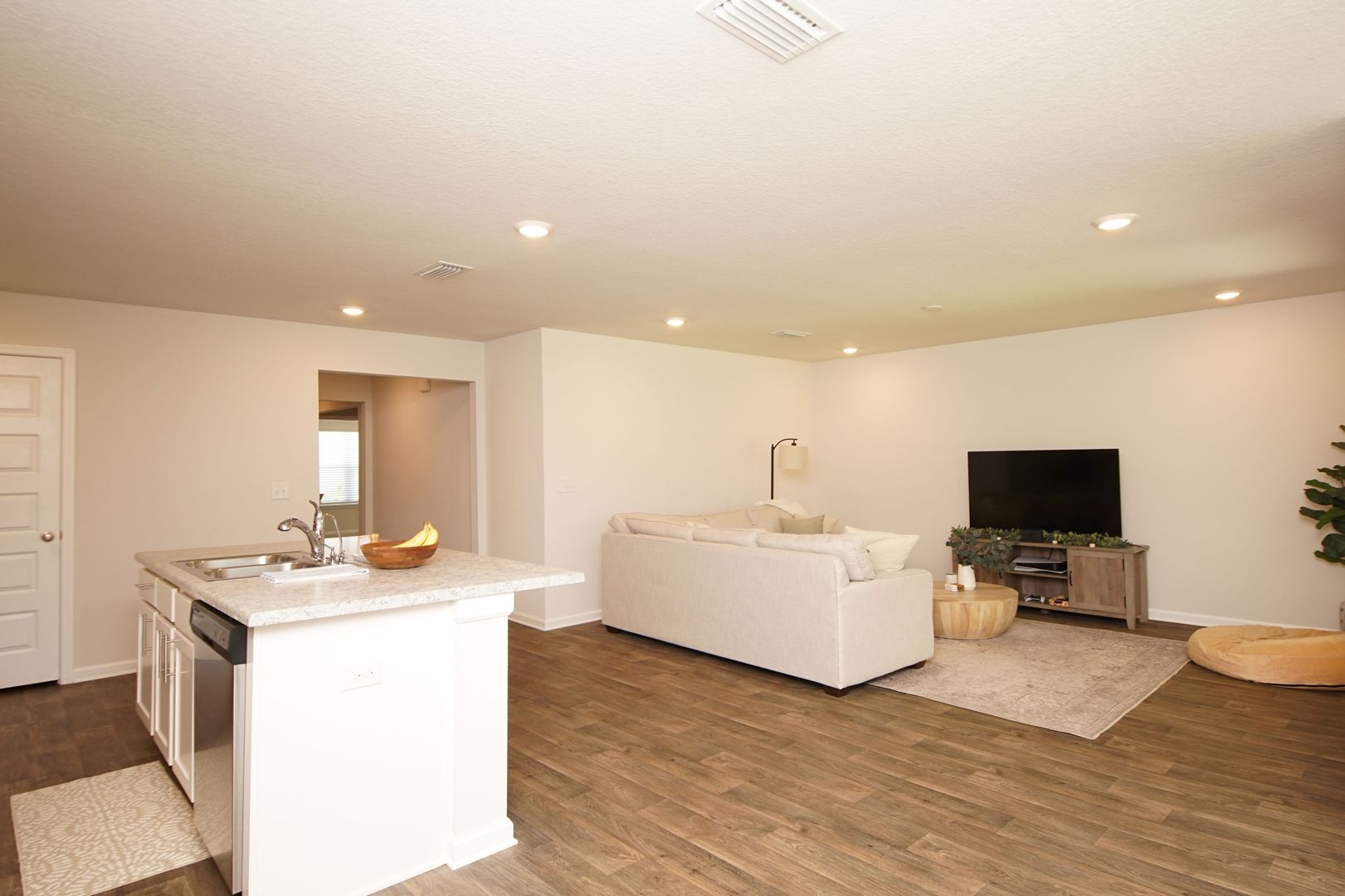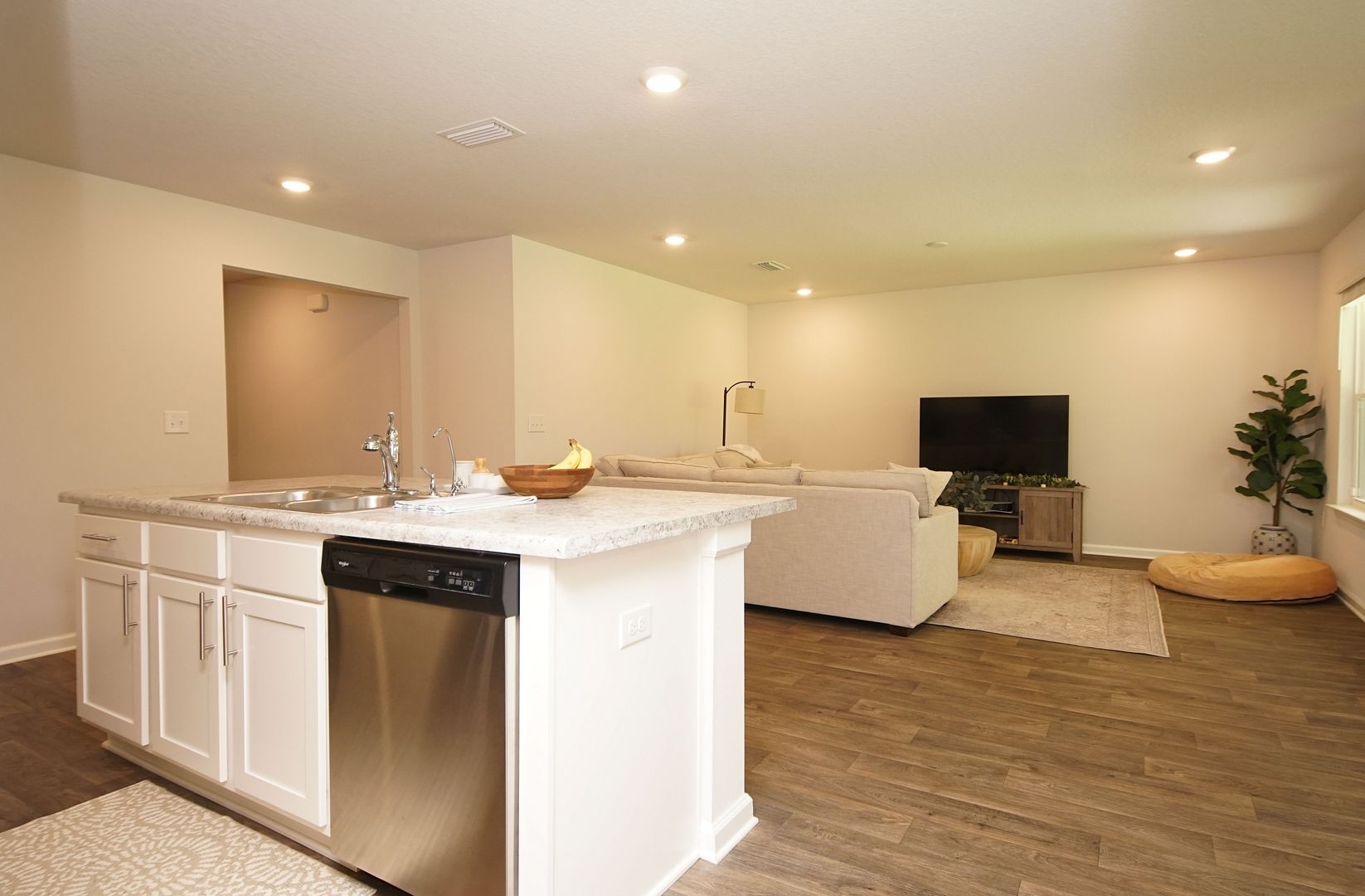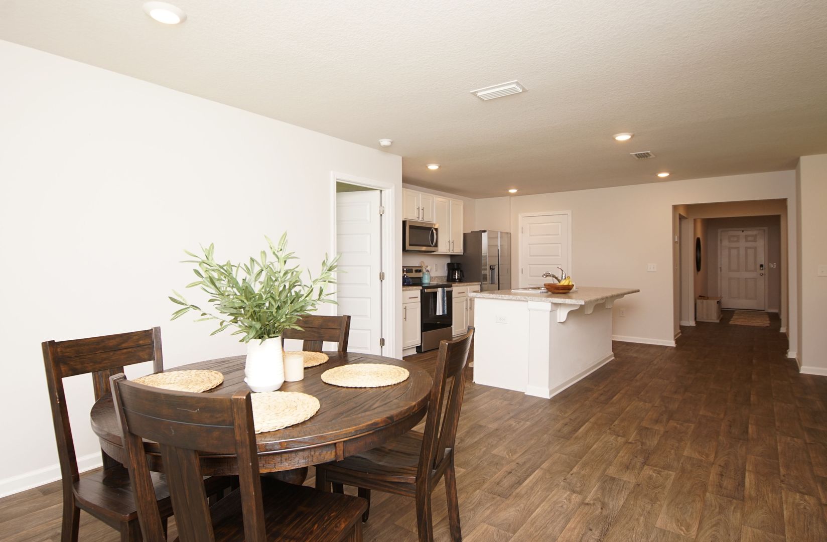 This inviting home features an open floor plan with two bedrooms and a full bath at the front of the house, and a spacious primary suite tucked privately at the back. The kitchen boasts shaker-style cabinets, stainless steel appliances, a large island, and a dining area overlooking the backyard. The generous living room flows seamlessly from the kitchen, creating an ideal layout for everyday living and entertaining.